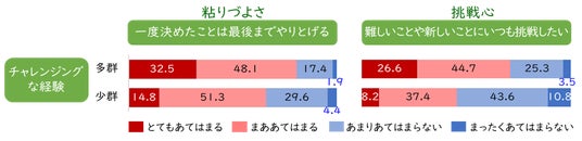 「チャレンジングな経験」が多い子ども(多群)は少ない子ども(少群)に比べて、「一度決めたことを最後までやりとげる」(粘りづよさ)、「難しいことや新しいことにいつも挑戦したい」(挑戦心)を肯定する割合が高い。「チャレンジングな経験」は、こうした非認知能力と関連がみられる。