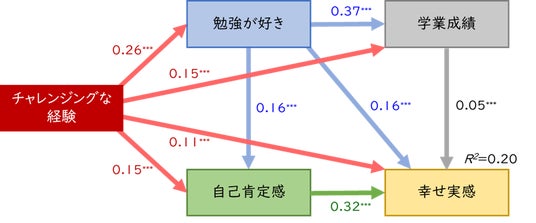 「チャレンジングな経験」は「勉強が好き」の意識、「自己肯定感」「学業成績」「幸せ実感」などのさまざまな要因に影響する。直接的な効果だけでなく、「勉強が好き」を経由して「学業成績」や「幸せ実感」を高めるといった間接的な効果もみられる。