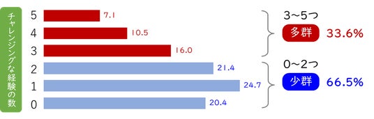 「チャレンジングな経験」をどれくらいしているかによって、「多群」33.6%と「少群」66.5%に分類した。