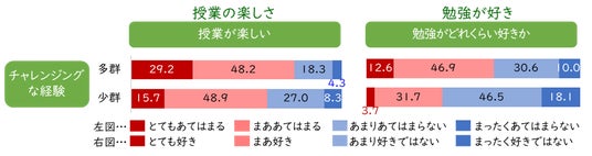 「チャレンジングな経験」が多い子ども(多群)は少ない子ども(少群)に比べて、「授業が楽しい」や「勉強が好き」を肯定する割合が高い。「チャレンジングな経験」は、学習に対する意識と関連している。
