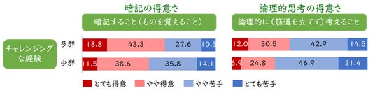 「チャレンジングな経験」が多い子ども(多群)は少ない子ども(少群)に比べて、「暗記すること(ものを覚えること)」や「論理的に(筋道を立てて)考えること」に対して「得意」だと回答する割合が高い。「チャレンジングな経験」は、認知的な能力に対する自己評価とも関連がみられる。