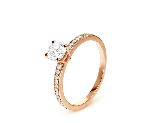 華やかなピンクゴールドのアームにあしらわれた優美なパヴェダイヤモンドが、センターにほどこされたラウンドブリリアントカットのダイヤモンドの透明度ときらめきを更に高めるエレガントなデザインの新しいエンゲージメントリングと並び、インナーストーンのダイヤモンドがあしらわれたピンクゴールドのマリッジリングがこの度デビューいたします。すべての「ローマ アモール」のマリッジリングには、内側にダイヤモンドがあしらわれ、親密な関係の深い結びつきを表現しています。そして、地球上で最も硬い天然物質の一つであり、比類なき輝きを放つ永遠のダイヤモンドは、希少で幻想的とも言える貴石です。それは永遠の都と同じように不朽の愛の喜びを今、そして永遠に称える完璧なジェムストーンなのです。
