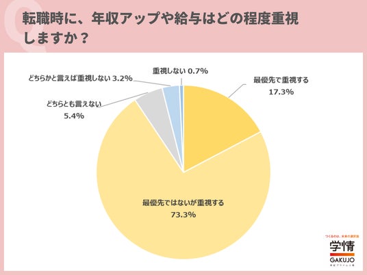 転職時に、年収アップや給与を「最優先で重視する」と回答した20代は17.3%でした。最も回答を集めたのは、「最優先ではないが重視する」73.3%となっています。「給与は働く上でのモチベーションに直結する」「自分の能力と成果に見合った報酬かどうかが重要だと考えている」「給与だけではなく、自分に合った仕事内容であるかも見極めたい」といった声が上がりました。