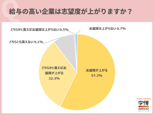 株式会社学情(本社:東京都中央区)は、20代の仕事観や働く意識をひも解くために、アンケート調査を実施しました。今回は、「給与」について調査。9割を超える20代が、昇給や待遇改善に取り組む企業に魅力を感じると回答しました。また、9割に迫る20代が、給与が高い企業は志望度が上がるとしています。「生活水準を保つうえで給与は重要」「給与が高い企業は、成長している企業だと感じる」といった声が寄せられています。一方、転職において年収アップや給与を「最優先で重視する」と回答した20代は17.3%に留まりました。「最優先ではないが重視する」の回答が7割を超え、最優先ではないものの重要項目の1つであることが分かります。「自分の能力と成果に見合った報酬かどうかが重要だと考えている」「給与だけではなく、自分に合った仕事内容であるかも見極めたい」といった声が上がっています。