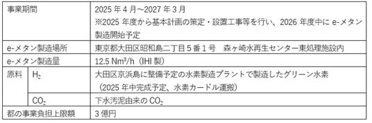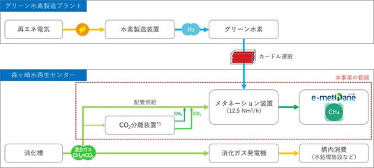 本事業は、東京都が大田区京浜島にて製造するグリーン水素と、大田区昭和島(森ヶ崎水再生センター)における下水汚泥由来の混合ガス中(*1)のCO2を原料として、メタネーション装置にてe-methane(以下「e-メタン」)を製造するものです。なお、下水汚泥から発生する混合ガス中のCH4とCO2を分離せずに、原料として配管により連続的に供給しながらe-メタン製造を行う取り組みは国内初になります。