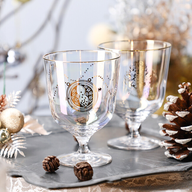 きらきらと上品な虹色に輝くオーロラゴブレットは、タイムターナーとホグワーツエンブレムのデザインの2個セットで、日々の暮らしに魔法を感じられるようなアイテムです。もちろん特別な日にご使用いただくのもおすすめです。箱入りの本商品はギフトにもぴったりです。