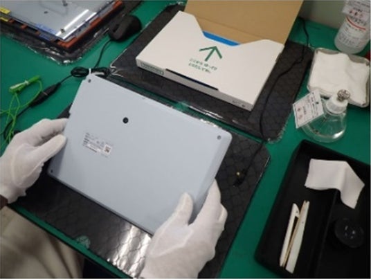 外観チェックのうえ、顕著な汚れ・傷が残り、リユースに適さない製品をあらかじめ選別したうえで、製造工場に戻して内部データを完全に削除して初期化し、工場出荷時と同様の状態にします。その後、外装クリーニングを行ったうえで、あらかじめ同意とご理解を得たお客様へ再度出荷されます。タブレット1台のリユースで、杉の木5本強が1年間に吸収するCO2排出を回避することができると試算しています。