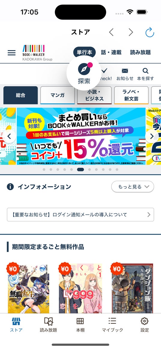 1)iOS版およびAndroid版BOOK☆WALKERのストア画面にある「探索」アイコンをタップする