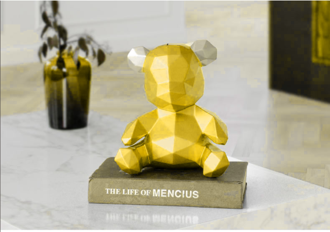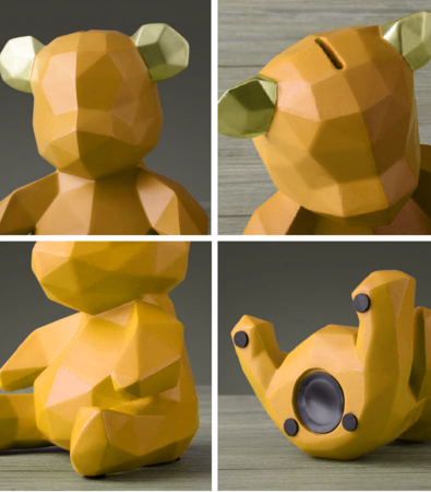 耳や手足の部分まで幾何学的な形状を取り入れるなど、「GeeSavingBear」は細部にまでこだわりを詰めた貯金箱です。