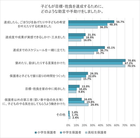 また、小学生保護者では「達成したら、ごほうびをあげたり子どもの希望を叶えたりする約束をした」「達成までのスケジュールを一緒に立てた」という保護者も多かった。