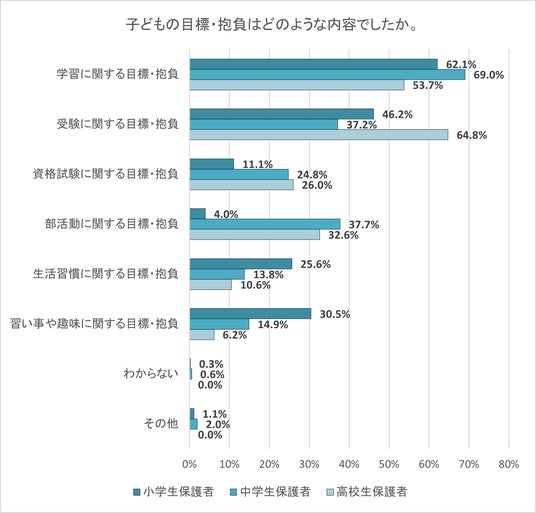 また、小学生保護者は「生活習慣に関する目標・抱負」「習い事や趣味に関する目標・抱負」が、中学生保護者・高校生保護者よりも割合が高く、中学生保護者・高校生保護者では「資格試験に関する目標・抱負」「部活動に関する目標・抱負」が高い傾向にあることが分かった。