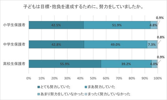 子どもが「2024年の目標・抱負を決めていた」と回答した保護者に、子どもが目標・抱負を達成するために努力していたかを聞いた。小学生保護者・中学生保護者・高校生保護者いずれも、9割以上が「とても努力していた」「まあ努力していた」と回答した。特に高校生保護者では「とても努力していた」と回答した割合は55.9%にのぼり、保護者が子どもの努力を高く評価していることが分かった。