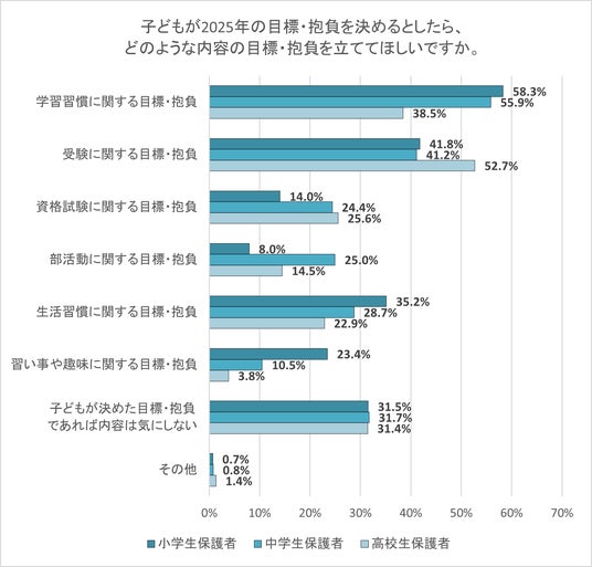 また、小学生保護者・中学生保護者・高校生保護者いずれも約3割が「子どもが決めた目標・抱負であれば内容は気にしない」と回答した。