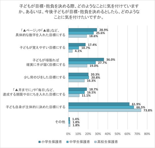 子どもが目標・抱負を決める際に気を付けていること、または今後気を付けたいことを保護者に聞いた。最も多かったのは、小学生保護者・中学生保護者・高校生保護者いずれも、「子ども自身が主体的に決めた目標にする」で、小学生保護者の61.9%、中学生保護者の66.5%、高校生保護者の73.8%だった。