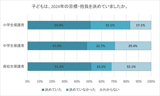 小学1年生~高校3年生の子どもをもつ保護者に、子どもが2024年の目標・抱負を決めていたかを聞いた。小学生保護者の50.8%、中学生保護者の47.9%、高校生保護者の51.4%が「決めていた」と回答した。また、子どもの年齢が上がるにつれ、「わからない」の回答が増える傾向があった。
