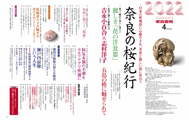株式会社世界文化社は、『家庭画報 4月号』を3月1日(火)に発売しました。今号では、「奈良の桜紀行」と題し、古都奈良の桜の名所を大特集。迫力ある写真で咲き誇る桜と、美食処と新しい宿をご紹介します。また、「麗しき花の洋食器」では、おうち時間を豊かに演出する、フラワーモチーフの器を特集。春目前、心踊る季節にふさわしい企画満載でお届けします。