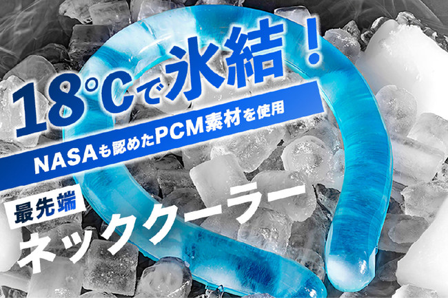▲冷蔵庫で20分程度、氷水なら10分で凍結するPCM素材を応用氷点が18℃になるように独自配合を行い、ネッククーラーに応用しました
