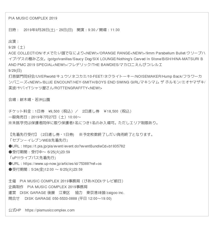 2017 年2018 年と実施してきた「PIA MUSIC COMPLEX」(通称「ぴあフェス」)が、 今年も新木場・若洲公園にて、 9月28 日(土)・29 日(日)に開催。本日、第4弾アーティストの発表。全ラインナップが決定いたしました。
