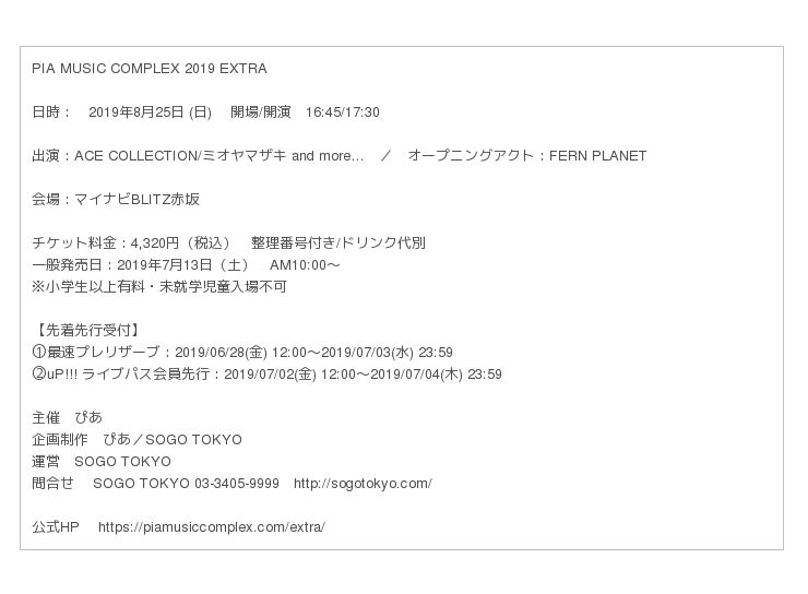 また、8月25日(日)には、ぴあフェスプレイベントとして、「PIA MUSIC COMPLEX 2019 EXTRA」の開催が決定! ACE COLLECTION、ミオヤマザキが出演。オープニングアクトはFERN PLANET。こちらもぜひご期待ください。