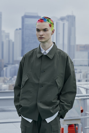 トップスはハンティング系のディテールでありながら、ジャケットでもなくはたまたコーチ型のデザインでもない。