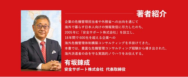 本書の著者は、企業の海外危機管理体制構築のコンサルティングをはじめとした総合的な支援を行う安全サポート株式会社の代表取締役 有坂鍊成さんです。18年間で600社を超える企業へのコンサルティングを手掛けてきました。