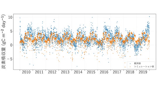 炭素吸収量の観測値とシミュレーション値のグラフ