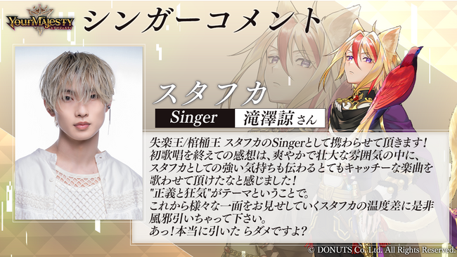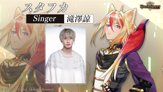 株式会社DONUTS(東京都渋谷区、代表取締役:西村啓成)が運営するメディアミックスプロジェクト「正義」と「狂気」の物語『ユアマジェスティ』は、【失楽王/棺桶王 スタフカ】[CV:宮崎遊]の新シンガーとして、劇団四季『ライオンキング』 ヤングシンバ役でデビューし、現在は2.5次元舞台を中心に活躍する人気俳優の滝澤諒を新たに起用いたします。