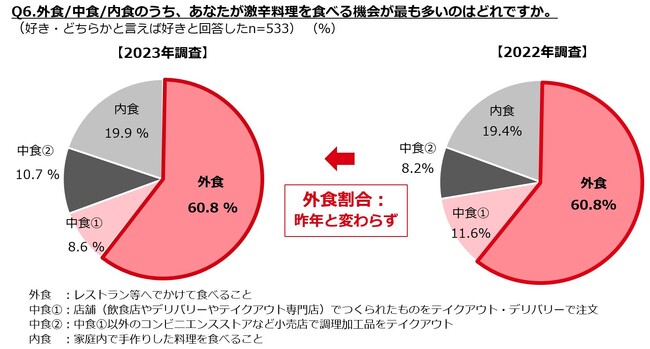 ・激辛料理を食べる機会が最も多いのは、昨年に引き続き「外食」が6割と最多。