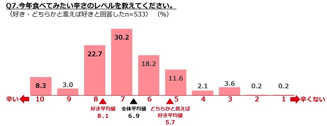・食べてみたい辛さのレベルは平均6.9で、最多は3割が支持したレベル「7」に。