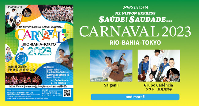 『NX NIPPON EXPRESS SAUDE! SAUDADE...』は、ブラジルを中心に、フランスなどのヨーロッパやラテンアメリカの音楽と、その土地やミュージシャンにまつわる話題をお届けする、J-WAVE開局当初から続く人気プログラム。同番組がプロデュースする「J-WAVE<NX NIPPON EXPRESS SAÚDE! SAUDADE...>CARNAVAL 2023」は、3年ぶり、25回目の開催となります。