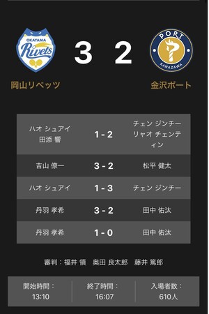 2023-12-23 一般社団法人Tリーグ ノジマ リーグ 2023-2024シーズン 公式戦 12月23日開催 岡山リベッツvs金沢ポート 試合結果 Tweet 岡山リベッツと金沢ポートの試合は、3-2で岡山リベッツが勝利しました。 企業プレスリリース詳細へ PR TIMESトップへ 公式ツイッター Follow @Straightpress 最新情報をTwitterで受け取ろう! 公式フェイスブックページ 最新情報をFacebookで受け取ろう! 前の記事 一覧へ戻る 次の記事