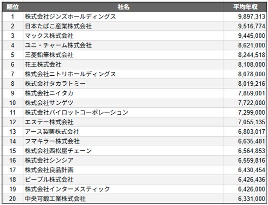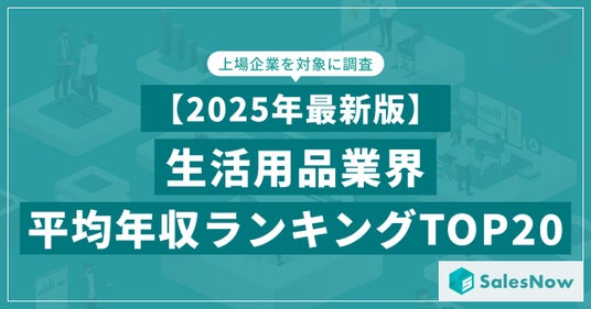 株式会社SalesNow(本社:東京都渋谷区、代表取締役:村岡功規、以下「当社」)は、国内540万社の企業情報を完全網羅した日本最大級のデータベース「SalesNow DB」より、上場企業における生活用品業界の平均年収ランキングTOP20をお知らせします。