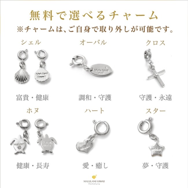 チャームは、ハート、スター、オーバル、クロス(シンプル)、シェル、ホヌより、お好きなモチーフをお選びください。