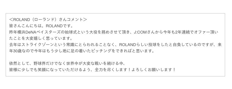 始球式は、2021年 9 月 12 日(日)に、横浜スタジアムで行われる「横浜DeNAベイスターズ」対「阪神タイガース」戦で開催されるスペシャルイベント「キッズSTAR☆NIGHT2021 Supported by J:COM」にて行われ、ROLANDさんが試合前の会場を熱く盛り上げます。