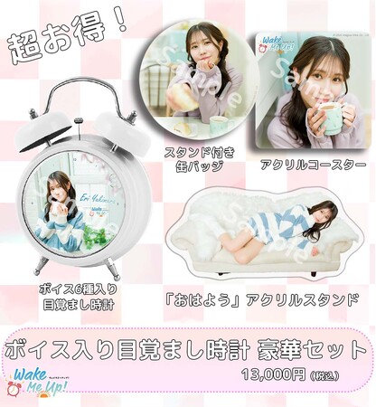 生放送中に決定したセリフ6種が入った超レアな目覚まし時計に加え、一緒に朝食を食べているような体験ができるスタンド付き缶バッジやアクリルコースター、「おはよう」アクリルスタンドが詰まった豪華セット。