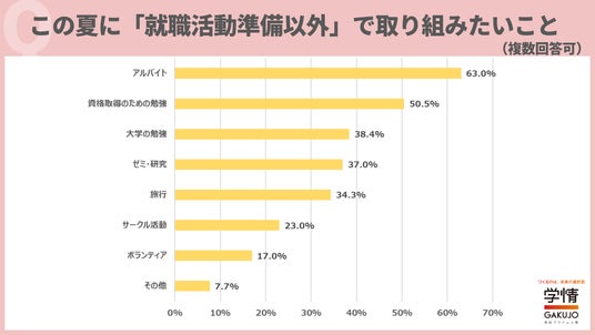 夏休み中に「就職活動準備以外」で取り組みたいことは、「アルバイト」が63.0%で最多。次いで、「資格取得のための勉強」50.5%、「大学の勉強」38.4%が続きました。「就職活動にもお金が必要なので、アルバイトをして貯金をしておきたい」「将来英語を使って仕事をしたいので、TOEICの点数を上げたい」「専門的な知識を身につけて就活に臨みたい」「ガクチカにつながるゼミの研究やボランティアに力を入れたい」などの声が上がりました。