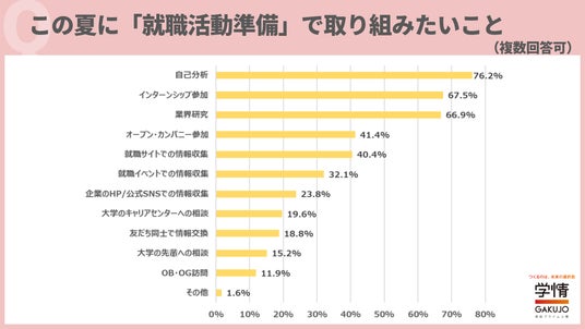 夏休み中に「就職活動準備」で取り組みたいことは、「自己分析」が76.2%で最多。次いで、「インターンシップ参加」67.5%、「業界研究」66.9%が続きました。「選考が始まる前に就活の軸を定めたい」「夏休み中に就活を進め、できれば早期選考にも繋げていきたい」「インターンシップに参加する企業を中心に業界・企業研究を進めたい」「この夏休みでどれだけ情報を集められるかが鍵になると考えている」といった声が寄せられました。