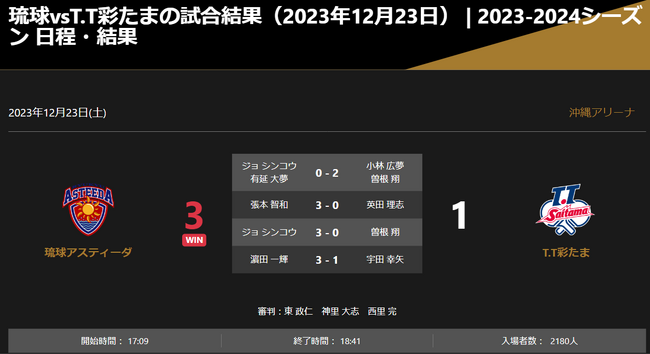 2023-12-24 一般社団法人Tリーグ ノジマTリーグ 2023-2024シーズン 公式戦 12月23日開催 琉球アスティーダvsT.T彩たま試合結果 Tweet 琉球アスティーダとT.T彩たまの試合は、3-1で琉球アスティーダが勝利しました。 企業プレスリリース詳細へ PR TIMESトップへ 公式ツイッター Follow @Straightpress 最新情報をTwitterで受け取ろう! 公式フェイスブックページ 最新情報をFacebookで受け取ろう! 前の記事 一覧へ戻る 次の記事