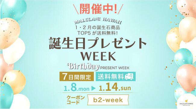 概要:マルラニハワイ オンラインショップで1月・2月誕生石アイテムの売上ランキング 上位トップ5の商品を含んでお買い物いただいた際に、クーポンコード【 b2-week 】をご入力いただくと送料無料!