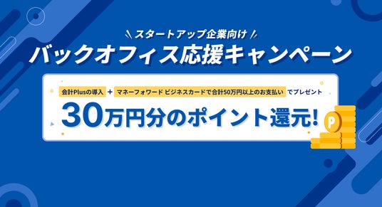 株式会社マネーフォワードは、『マネーフォワード クラウド会計Plus』と『マネーフォワード ビジネスカード』を導入するスタートアップ企業向けに、2024年11月30日までの期間限定で「バックオフィス応援キャンペーン」を実施しています。本キャンペーンでは、『マネーフォワード クラウド会計Plus』を契約の上、『マネーフォワード ビジネスカード』を発行し、支給条件を満たした企業に対し、『マネーフォワード ビジネスカード』の30万円分のポイントを付与します。