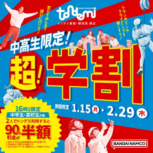 株式会社バンダイナムコアミューズメントは、屋内アスレチック施設「トンデミ幕張」「トンデミ横須賀」にて、2024年1月15日(月)から2月29日(木)の期間中、16時以降のトンデミ利用2人以上で1人あたりの料金が半額になる中高生限定「超!学割」を実施します。