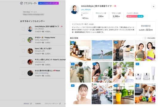 商品・サービスのURLを入力するだけで最適なインフルエンサーを即時レコメンド、インフルエンサーマーケティングの効率化を実現