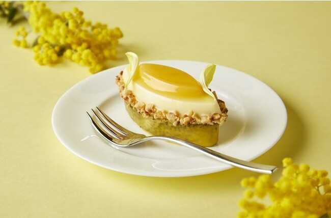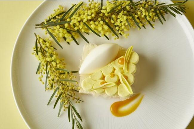 伝統的なフランスのデザート、ヴァシュランをブラッスリー・デュ・ケ風に仕立て、アーモンドのスポンジ生地にホワイトチョコレートムース、グレープフルーツ果肉の層を重ね、メレンゲのお菓子で「ハッピーイエロー」を表現しました。レモンシャーベットを添えて、柑橘とホワイトチョコレートとの絶妙な味覚のバランスをお楽しみいただけます。