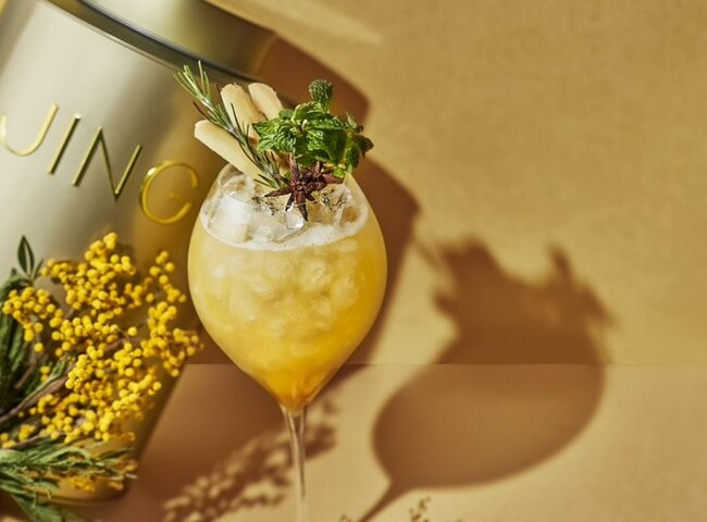 ホワイトティーのシロップ、パッションフルーツとジンジャーエールのグラデーションが黄色に輝くルックスは、希望や明るさ、いきいきとした生命力をイメージして作成いたしました。体の内側から温まる生姜をたっぷりと使用し、トップには、スターアニスや炙ったローズマリーを添えて、非日常感を誘う香りをお届けします。一日の終わりに心と身体をほぐすカクテルです。