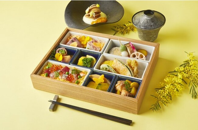 地元神奈川県で採れた旬の野菜の味覚と美しさを引き出した「黄色い野菜のボイルサラダ」や、ビタミンが多く含まれる黄色人参や南瓜などの「黄色い野菜の煮物」をはじめ、「ローストビーフの野菜巻き」など、栄養をバランスよく取り入れた、五感が喜ぶ品々をお弁当スタイルでご用意いたしました。デザートには、杏仁パンナコッタに山椒のチュイールにアプリコットのソースを添えて、黄色のエディブルフラワーをアクセントにしてご提供いたします。