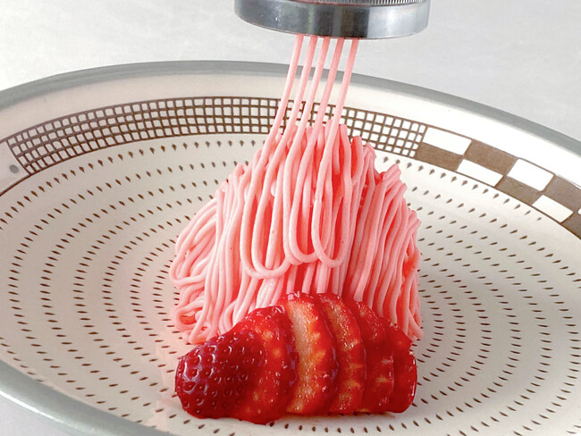 福岡県産あまおうにカスタードクリームとクリームチーズのバランスが絶妙なオリジナルの苺モンブランクリームは、いちごの豊かな香りと上品な甘さの中にほのかな酸味を感じる、さっぱりとした爽やかな味わいが特徴です。お召し上がり直前にお客様の目の前で仕上げるモンブランには旬のフレッシュ苺をトッピングし、見た目も春らしい華やかなイメージに仕上げました。提供の際には、独特の温かみと風合いで人気の「小石原焼」の器を使用いたします。「できたて」「しぼりたて」でしか味わうことができない香り、濃厚な味わいと食感をぜひお楽しみください。
