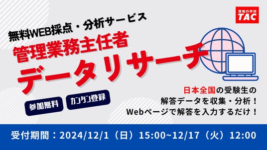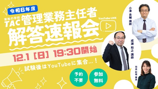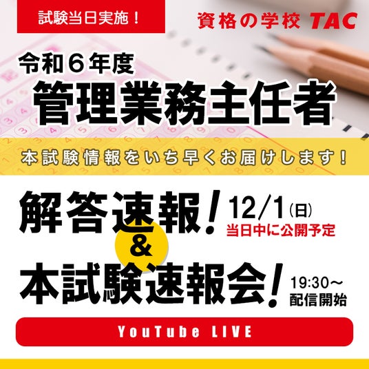 公認会計士や税理士など、数多くの国家資格や検定試験の受験指導といった教育事業を展開しているTAC株式会社(東京都千代田区、代表取締役:多田敏男)は、12/1(日)に実施される『令和6年度 管理業務主任者試験』の解答速報を試験当日にTACのWebサイトで公開いたします。さらに、当日には『本試験速報会』も開催し、その模様をYouTubeでLIVE配信いたします!スマートフォン・タブレット端末からもご視聴いただけますので、 ぜひ奮ってご覧ください!