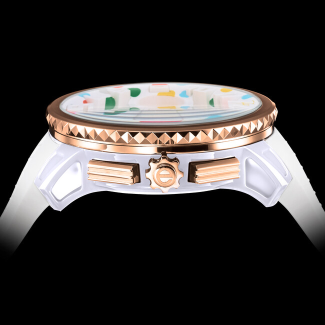 “スタジアム”とも呼ばれるすり鉢状の文字盤を余すところなく使用してPlayfulで鮮やかなカラーを散りばめたアーティスティックなコレクション。ブラックのモデルはステンドグラスのようなランダムなデザイン、ホワイトのモデルはドットを自由に散りばめました。
