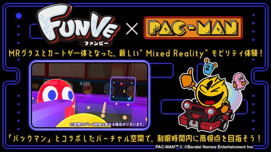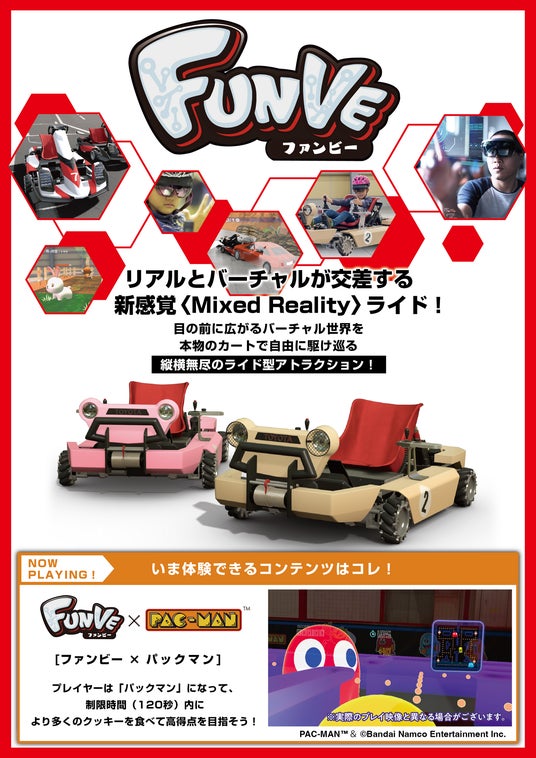 2022年9月にVS PARK イオンレイクタウンmori店で実施したときからバージョンアップし、「パックマン」とコラボレーションしたソフトを導入。クッキーを食べて、ゴーストから逃げる「パックマン」のゲーム性をそのまま、縦横無尽に動けるFUNVEのカート体験と掛け合わせた新感覚のアクティビティです。