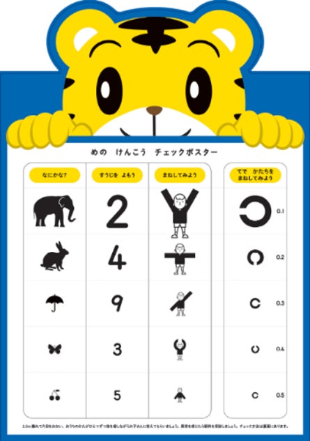 イラストや数字を見ながらクイズをしたり真似をしたりして遊ぶことができ、親子で楽しく目の健康を確認いただけるポスターです。